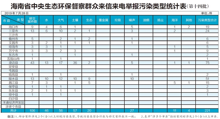 海南省中央生态环保督察群众来信来电举报污染类型统计表(第十四批)