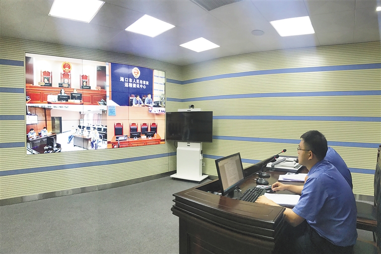 此外,依托检法专线网,海口市检察院还建成减假科技法庭,实现检察院、法院、执行机关三方异地远程视频开庭。法院在减假科技法庭开展审理活动时,执行机关对拟减刑罪犯的改造情况进行举证,法官讯问罪犯,罪犯当庭陈述,出庭检察官讯问罪犯、对执行机关出示的证据进行质证,发表监督意见,法庭当庭宣判。