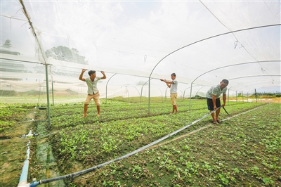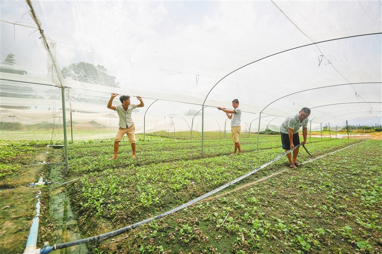 7月30日,海口市美兰区美庄村常年蔬菜生产基地,农户抓紧时间加固蔬菜大棚,疏通沟渠,保证排水通畅。本报记者 袁琛 摄