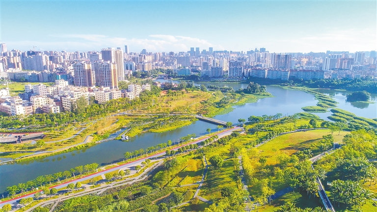 椰子树、美人蕉、莲雾、蜜柚……绿草浓密的凤翔湿地公园里,海南本土的绿植安静地生长在绿道两旁。园内还有利用坡地改造成的层层递进的八级水景梯田。每层梯田有四五米宽,蜿蜒曲折顺着美舍河的走向延伸。梯田里的水是活的,下一层梯田接着上一层流下的水,每一层又都具蓄水能力,种植着王莲、荷花、水菜花、翠芦莉等水生植物。