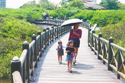 针对孩子开展的自然教育是什么?顾名思义就是将课堂转移到大自然中,让孩子在自然中接受教育。沿着红树林里的木栈道前行,就可以去认识各类红树。一望无际的绿、水里悠哉的鱼、林间休闲的飞鸟,似乎都在和置身其中的孩子们说:慢慢走,慢慢看,慢慢享受这林间时光。