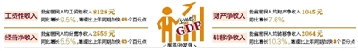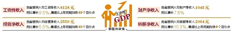 上半年,我省城乡居民收入稳步增长,增速快于地区生产总值(GDP)。全省居民人均可支配收入13796元,同比名义增长8.7%,扣除价格因素,实际增长6.5%。同期全省GDP增长5.3%,居民人均可支配收入实际增速快于GDP增速1.2个百分点,且实际增速与全国持平。