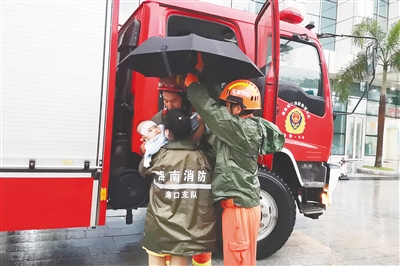 8月1日6时许,海口市滨海大道电力村电力城小区有一名一岁小男孩发高烧,但小区积水太深,父母无法涉水将其送往医院,只好向消防救援队求助。接到报警后,海口消防救援支队海甸中队6名消防指战员立即赶到现场,用消防车成功将小孩送到海南省人民医院儿科救治。