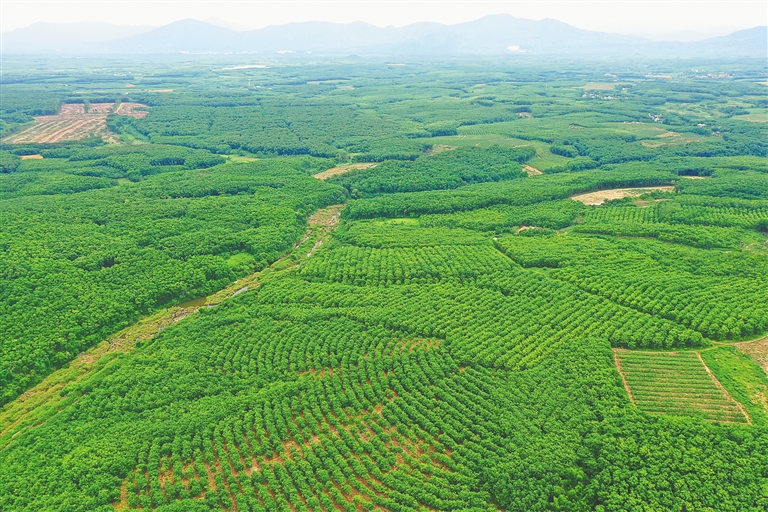 在白沙黎族自治县的绿水青山中,有海垦人种植的大片橡胶林,其中海南橡胶邦溪分公司的万亩天然橡胶示范园区格外引人注目。