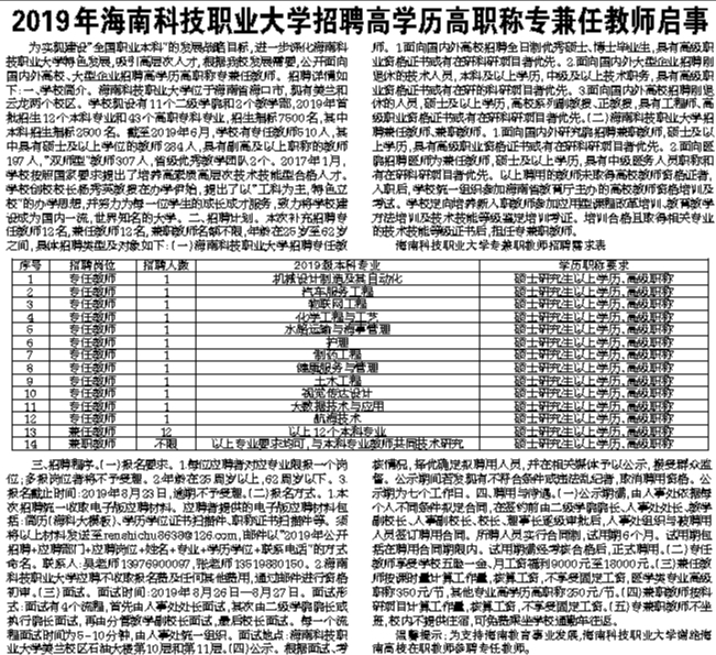 2019年海南科技职业大学招聘高学历高职称专兼任教师启事