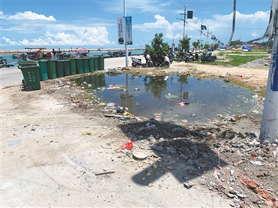 记者在码头现场看到,绵延的码头堤岸上设有多个垃圾集中处理点,但摆放整齐的垃圾桶里却是空空如也,而就在垃圾桶周围,不仅有散落的垃圾,还有死水潭,散发出令人作呕的气味,令来往群众掩面疾行。