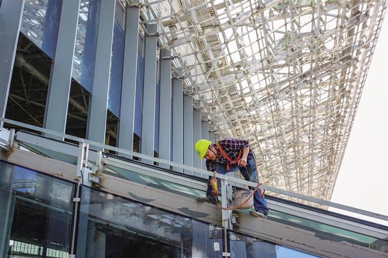 海口美兰国际机场二期扩建指挥部加快工程建设进度。截至目前,飞行区跑道、滑行道、站坪等道面工程及排水工程基本完工,航站楼金属屋面及玻璃幕墙进入收尾阶段。图为8月16日工人为钢梁刷防锈涂料。