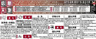 公告类信息:标题(字数在12个字以内),收费240元,内文(每行14个字)收费80元/行 商业广告:标题(字数在12个字以内),收费180元,内文(每行14个字)收费60元/行