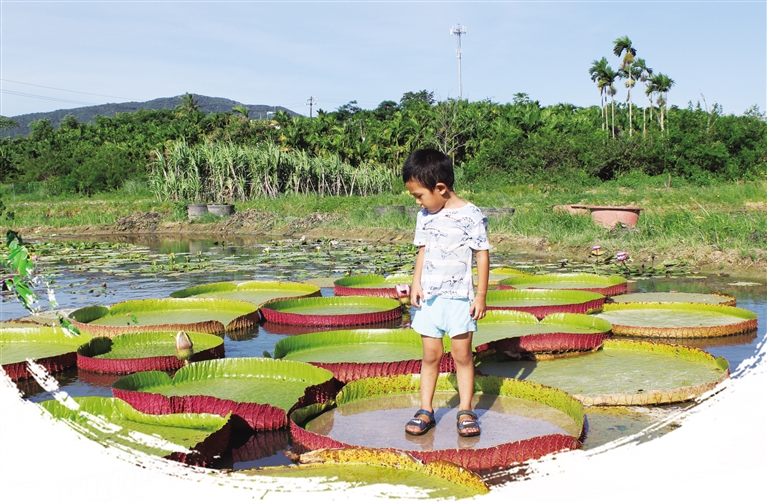 人立于叶片上,叶片不下沉——这不是武打影视剧里的“轻功”展示,也不是传说中的“神仙”在腾云驾雾,而是三亚市南繁科学技术研究院科研基地的新品种——王莲。王莲原产南美亚马逊热带雨林,叶片直径超过1米,数十斤重的小孩站在上面如履平地。