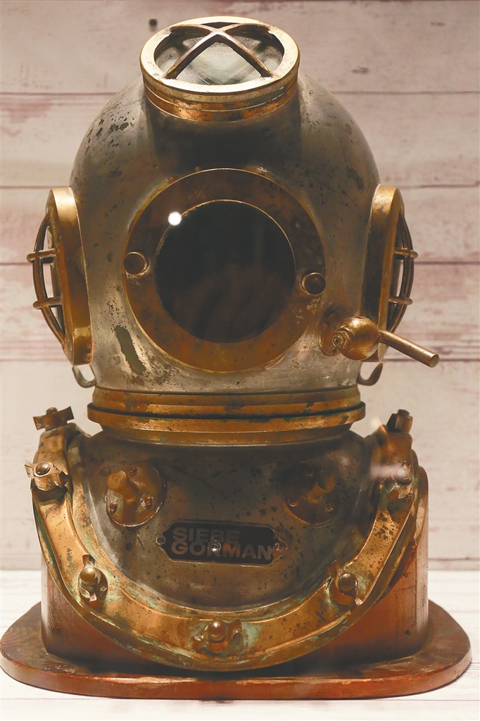 在展览中,我们不仅能够看到“船上”也能看到“船下”。船舶经过了漫长的旅途,船体便需要清洁与维护,船员们不得不潜水来解决。比起如今轻便的潜水服,几套来自19、20世纪的潜水装备显得有几分“惊悚”。1715年,法国人皮埃尔·雷米发明了最早的潜水服,这套装备由两根长长的软管连接,其中一根用于呼吸氧气,一根用于呼出二氧化碳。展柜中展示的几个沉重的潜水头盔和增重鞋让人深感当时潜水这项任务绝非易事。某种程度上,潜水装备的出现为航海的安全提供了重要的保障。