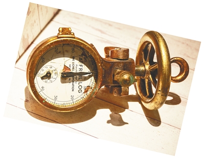 正如今天人们缺少不了导航一样,当时的航海人也少不了用磁罗经来导航。金色的立式磁罗经于20世纪初由美国波士顿里奇公司生产,宫廷式的装饰让人们联想到当时使用这台磁罗经的船只又该是何等模样。