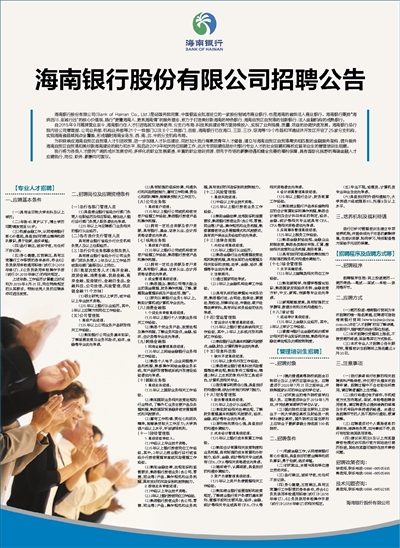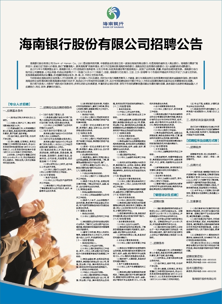 为积极响应海南自贸区自贸港人才引进政策,进一步加强人才队伍建设,同时加大我行高素质青年人才储备,建立与海南自贸区自贸港需求相匹配的金融服务架构,提升服务海南自贸区自贸港和美好新海南建设的能力和水平,现启动2019年相关岗位招聘工作,此次专项招聘包括针对银行专业人才的社会招聘和高校应届毕业生的管理培训生招聘。