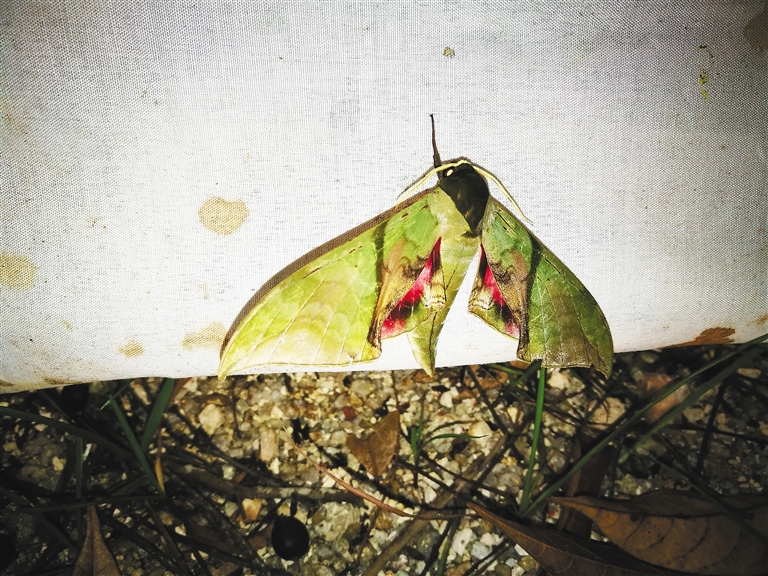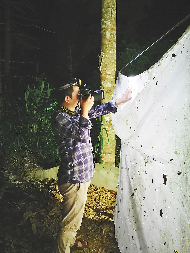 诱捕夜出性昆虫,宛若看一场“昆虫电影”。杨琪说,夜出性昆虫多是趋光的,为了采集到蛾子等夜出性的昆虫,他们会在凌晨一两点进行灯诱,“荒山野岭中,灯光打起来,围上来的虫子在灯光下飞舞,就像现实版的‘昆虫总动员’。”