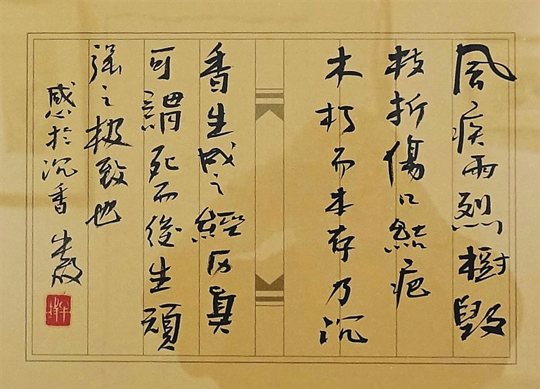 沉香生成栽种都非常不容易,所以它的沉是沉重艰难,得来不易,需要珍惜。牛放先生用灯草与沉香作比,表面看是一重一轻的两种物质比对,实则是艰难与轻取的分量,内中表达了对沉香的赞美深意,含蓄到位。海南书家范先生评价,牛放的书法大胆用笔流畅、自由,有书卷气。