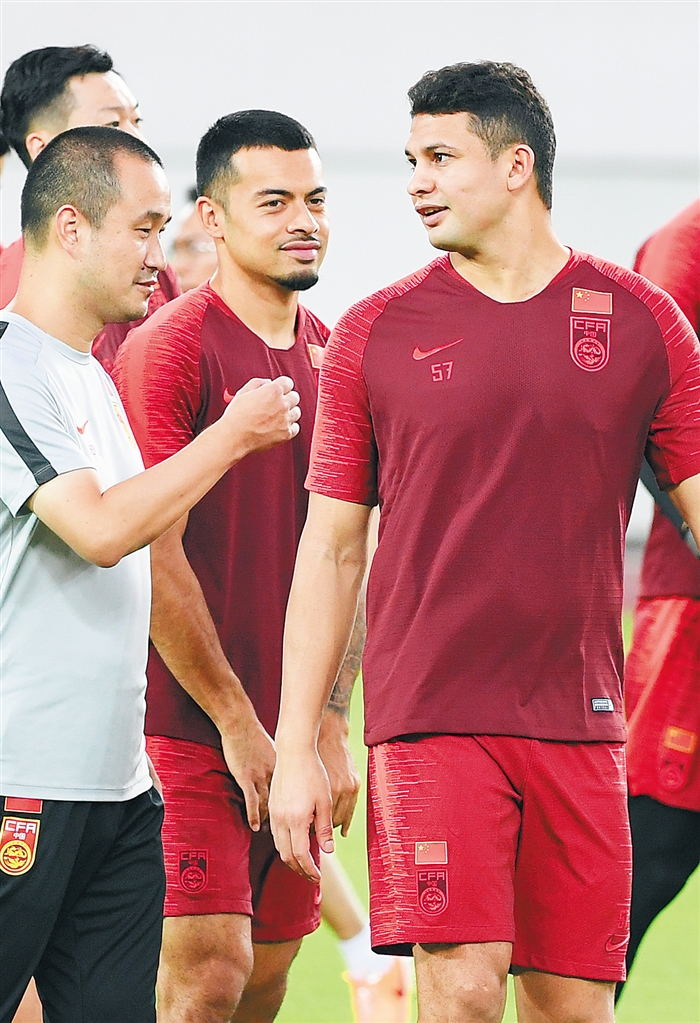 图为中国国家男子足球队球员艾克森(右一)、李可(右二)在训练中。 新华社发