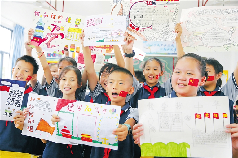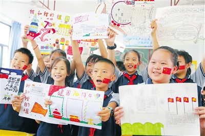9月2日,海口市玉沙实验学校开展爱国主义教育活动,图为学生展示自己制作的爱国主题手抄报。本报记者 张茂 摄