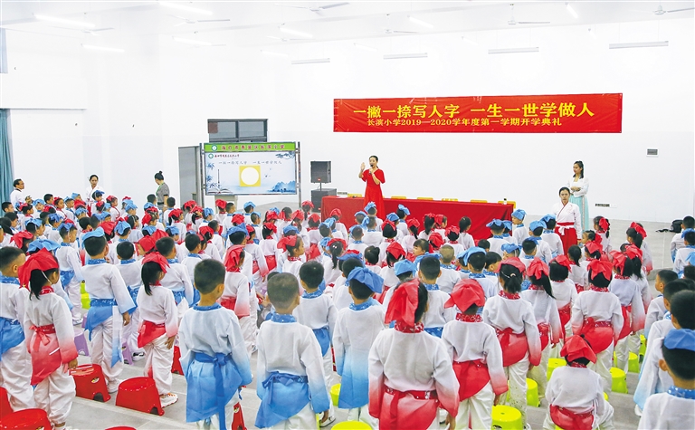 9月2日,海口市长滨小学迎来建成后的首次开学,学生和家长代表们一道参与校方精心准备的“汉式”主题开学典礼。 见习记者 封烁 摄