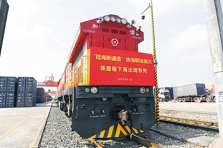 当日上午10点30分,“陆海新通道”铁海联运首次铁路箱下海出境专列在重庆团结村车站顺利发车。该班列23个柜子全部货物使用铁路集装箱装运,主要货物品类有汽车零配件、电子产品等,到达钦州港后再出口至越南、泰国、印度尼西亚等东南亚国家。 新华社记者 唐奕 摄