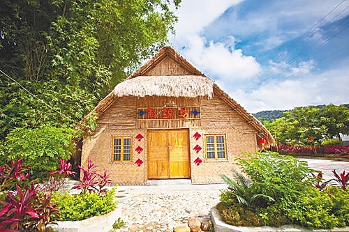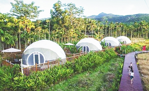 湖边漫步或环村骑行,远方青山连绵、云雾弥漫,近处的竹篱笆、黎家小屋与妙趣横生的涂鸦墙相得益彰。在保留乡村整体建筑风格和山体、树木原貌的基础上,中廖村将花海、星空帐篷、装配式酒店、咖啡屋、儿童乐园等现代化设施一一引入,让黎族元素与现代气息浑然天成。