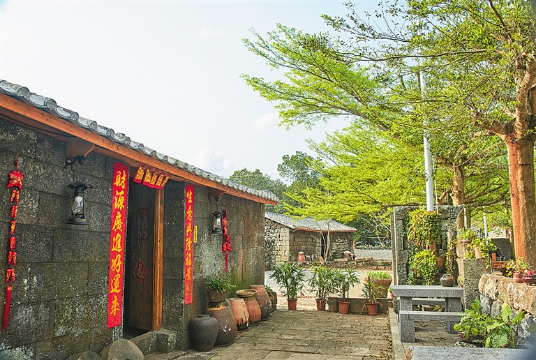 成片的橄榄林与热带火山雨林紧紧环绕,辅以一汪绿水碧湖,让村庄宛若一颗“绿宝石”镶嵌在火山岩上。石屋、石磨、石板路……穿过村口几株根虬交错的古榕树,映入眼帘的是一处未加修饰的石头世界。古屋修旧如旧,改造成“古村古屋艺术家创作联盟基地”“冯塘记忆咖啡屋”与“农耕文化展示馆”,为乡村野趣平添了几分人文之美。