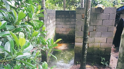 “就在那边,槟榔树下。”顺着他手指的方向,海南日报记者看见了用水泥砖块砌成的“厕所”。走近一看,“厕所”墙差不多与人齐高,没有屋顶,地板上长着湿滑的青苔,而且没有门。走进去发现,除了角落有一滩黄色尿液印记,里面连便池都没有,更别说水龙头之类的设施。