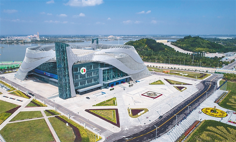 第四届中国—阿拉伯国家博览会开幕大会会址——宁夏国际会堂外景(9月4日无人机航拍)。