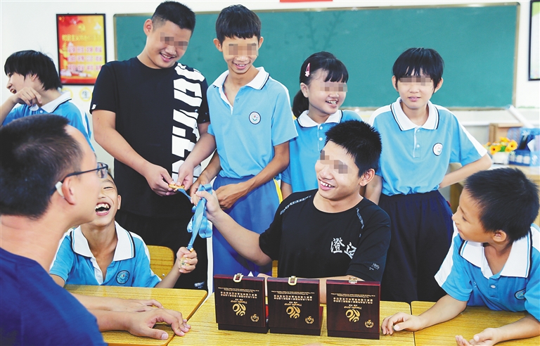 9月3日上午,海南日报记者来到澄迈县特殊教育学校时,刚从岛外赛场归来的3个孩子,正被其他同学团团围住,大家争着摸一摸那金灿灿的奖牌,获奖小选手骄傲地站在同学们面前,笑得合不拢嘴。