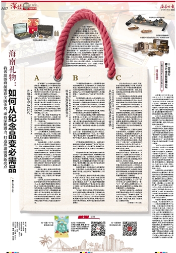 “在韩国济州岛,以国际大品牌吸引游客的同时,也注重推介当地特色旅游商品。在柬埔寨的免税店中,当地特色旅游商品也与国外各大品牌的免税商品同处一室。我们希望海南本土特色旅游商品也能登上免税店这个‘大雅之堂’,让充满海南味的旅游商品成为游客必带的伴手礼。”海南省旅游商品与装备协会副会长兼秘书长赵立春说。