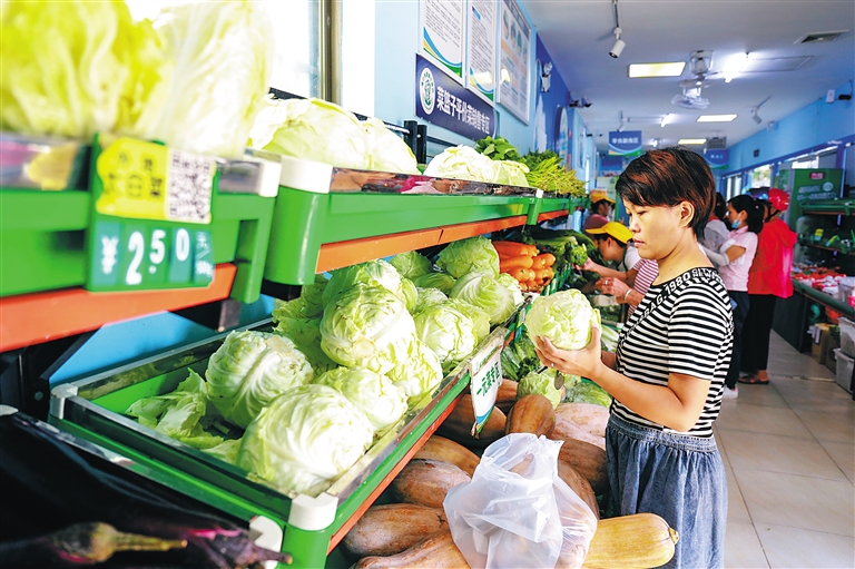 9月7日,海口市美兰区白龙南路,在海口社区菜篮子平价菜店琼苑店,工作人员摆放平价蔬菜(见上图),市民在选购蔬菜(见右图)。