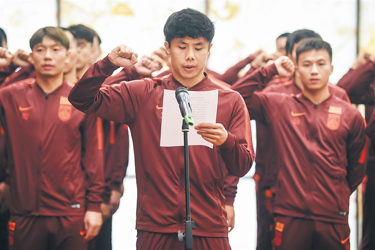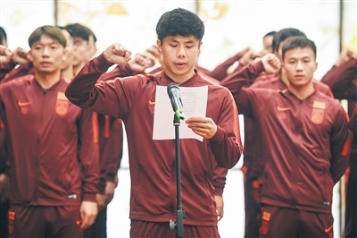 新任国家队队长蒿俊闵带领全体队员在国旗前庄严宣誓:为完成2022年卡塔尔世界杯任务,我将坚决执行主教练的命令;尊重规则、尊重裁判、尊重对手、尊重观众;恪守职业精神,绝不慵懒懈怠;展现良好形象,做青年人的榜样;自爱自律,为家人争光、对自己负责;永远把信任送给队友,我就在你身边;全力以赴拼搏,誓死捍卫祖国荣誉。