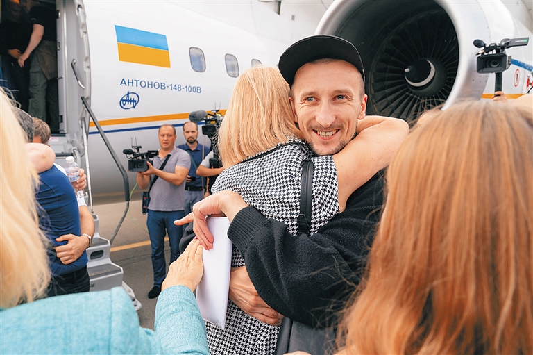 9月7日,在乌克兰鲍里斯波尔国际机场,被释放人员与亲属团聚。