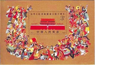 1989年10月1日,发行了《中华人民共和国成立四十周年》纪念邮票,全套4枚,小型张1枚,表现了我国百业兴旺、繁荣昌盛。小型张表现的是各族人民围绕天安门翩翩起舞。国庆50周年,发行了《民族大团结》纪念邮票一套,共56枚,每枚代表一个民族,以56个民族各一对青年男女载歌载舞来表现欢庆国家生日。56枚邮票印制在一整版之上,琳琅满目,是新中国成立以来枚数最多的一套邮票。