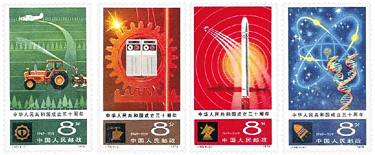 1979年中华人民共和国成立30周年之时,也发行了5组纪念邮票,其中第四组《欢庆》(4枚,每枚邮票上都是欢快的民族舞蹈)、第五组《四个现代化》(4枚,分别反映农业现代化、工业现代化、国防现代化、科学技术现代化),从中可以看出我国人民满怀豪情、积极向上的精神面貌及致力于现代化建设的信心与愿景。