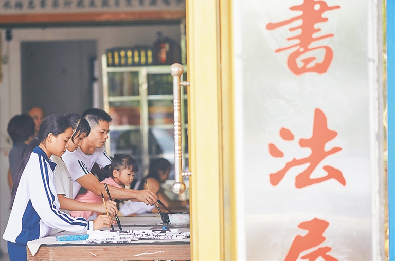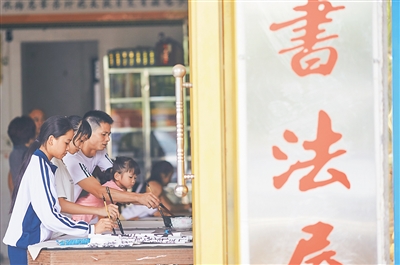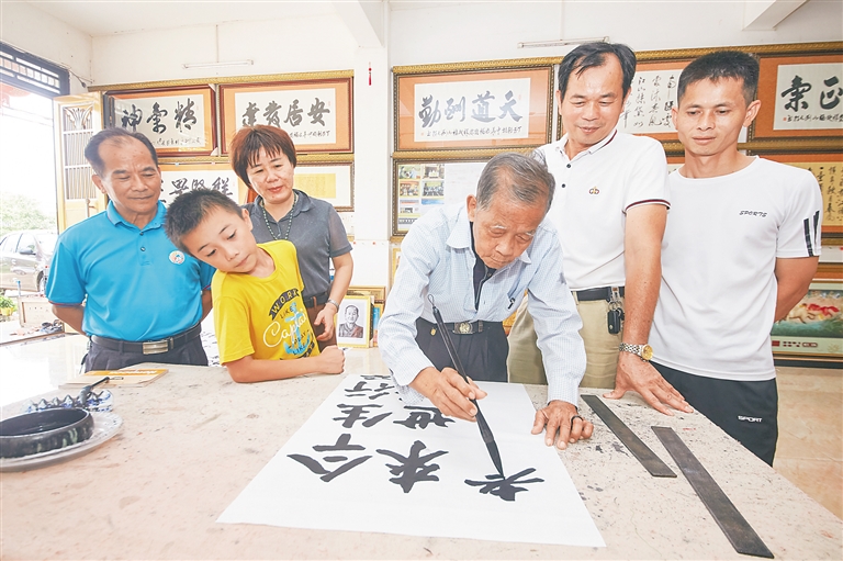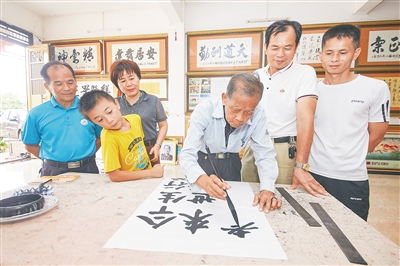 8月末的一天,澄迈县福山镇农民书法屋热闹起来。詹利慧、詹利敏两姐妹踏着欢快的步子来了,趁着暑假还有最后几天,她们还要抓紧请教“书法经”。紧接着,90岁的王德义也提着小布包进来了……不一会儿,小小的书法屋便陆陆续续聚集了10余人,大家自觉地铺上宣纸,拿起毛笔,开始练起字来。