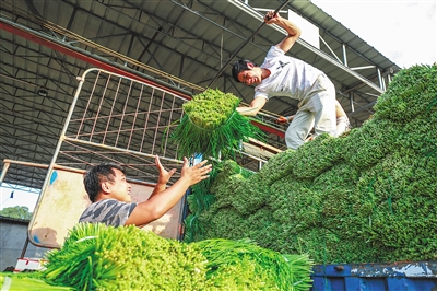 位于海口市的海南凤翔蔬菜批发市场和海口市菜篮子产业集团持续从岛外调运蔬菜,保证市场供应,稳定菜价。图为9月7日,海南凤翔蔬菜批发市场工人正卸载从广东运达的韭菜。