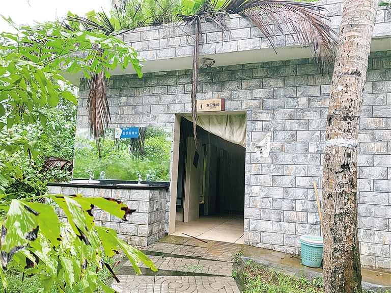 椰子大观园属于对外免费开放景区。景区游览示意图显示,内有两处公共厕所。记者根据示意图位置先去了景区中心区域的公厕,在通往该厕所的路途中,没有路牌指引,临近该厕所的石板路上长满荒草,整个厕所被周围的树枝遮挡。厕所屋顶上覆盖着枯死的椰树枝,没有得到及时清理。