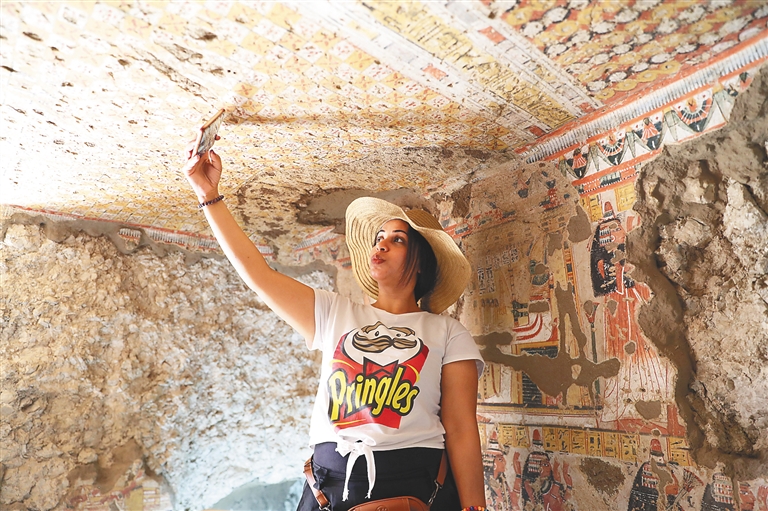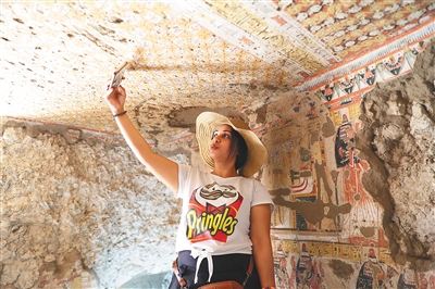 图为9月8日,在埃及卢克索,一名女子在一座古墓内自拍。 新华社发