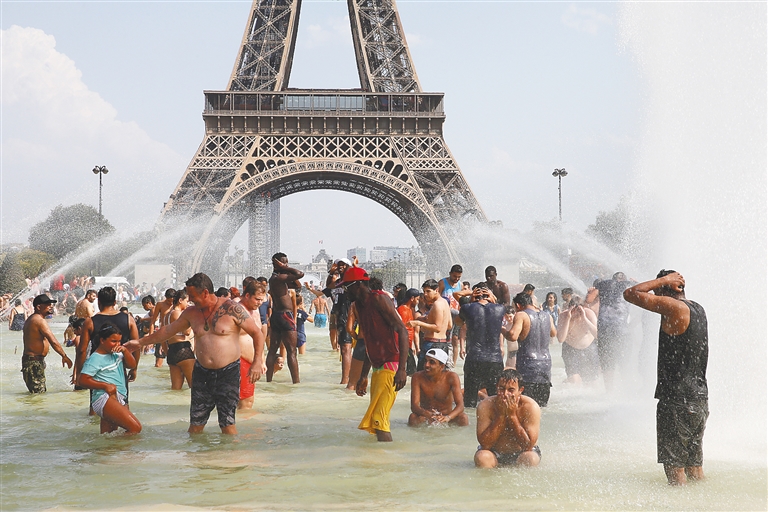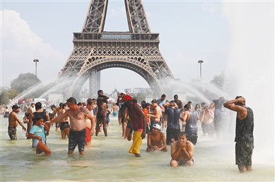 这张7月25日在法国巴黎拍摄的资料照片显示,人们在特罗卡德罗广场喷泉池中戏水消夏。
