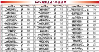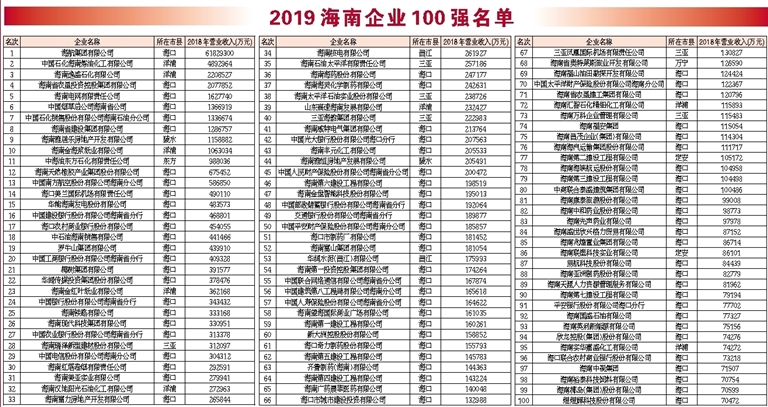 为推动海南省企业做优做强做大,持续健康成长,充分发挥大企业示范引领作用,提高海南大企业的竞争能力。海南省企业联合会、海南省企业家协会在省政府有关主管部门的大力支持下,经相关部门推荐,在海南省企业自愿申报的基础上,参照国际上通行的做法,以2018年企业营业收入为入围标准,排序出2019海南省企业100强,现将名单予以公示。公示无异议将进行公开发布。公示期:2019年9月10日至9月12日,电话:(0898)66538930传真:(0898)66569396。 海南省企业联合会 海南省企业家协会 二〇一九年九月十日