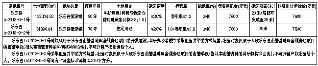 二、中华人民共和国境内外的法人、其他组织均可申请参加,申请人只能单独申请。申请人应具备的其他条件:竞买人可以是中华人民共和国境内外的法人或其他组织。法律法规另有限制的、或在乐东黎族自治县行政辖区内有闲置建设项目用地或拖欠土地出让金的除外。为保证项目能按时完成开发建设,竞买人自有资金必须不低于3亿元人民币(以本次挂牌出让公告发布后,竞买人同一开户银行账户出具的竞买人的存款余额证明为准)。三、本次国有土地使用权挂牌出让按照价高者得原则确定竞得人。四、本次挂牌出让的详细资料和具体要求,见《国有建设用地使用权挂牌出让手册》。申请人可于2019年9月16日至2019年10月14日到乐东黎族自治县抱由镇江北区自然资源和规划局大楼二楼土地储备整理中心或海南省政务服务中心一楼受理大厅3号窗口(土地产权交易)获取《国有建设用地使用权挂牌出让手册》。五、申请人可于2019年9月20日至2019年10月16日上午11时00分止到乐东黎族自治县抱由镇江北区自然资源和规划局大楼二楼土地储备整理中心或海南省政务服务中心一楼受理大厅3号窗口(土地产权交易)提交书面申请。交纳竞买保证金的截止时间为2019年10月16日11时00分(以到账为准)。经审核,申请人按规定交纳竞买保证金,具备申请条件的,我局将在2019年10月16日17时00分前确认其竞买资格。六、本次国有土地使用权挂牌活动在海南省政府会展楼二楼省公共资源交易服务中心土地交易厅。各地块挂牌时间分别为:乐东县Ln2018-9-1号:2019年10月8日9 时至2019年10月18日10时;乐东县Ln2018-9-2号:2019年10月8日9 时至2019年10月18日10时。七、其他需要公告的事项:1、竞买成交当天签订《成交确认书》,并在10个工作日内与我局签订《国有建设用地使用权出让合同》。2、成交价款不含各种税费(耕地占用税及双方的印花税由竞得者缴纳),其他税费按规定缴交。3、乐东县Ln2018-9-1号地块土地用途为科研用地(科研与物流仓储用地兼容比例8.5:1.5),只用于我县南繁基地配套服务区项目的开发建设,不得擅自改变用途。科研办公等楼宇采取租售并举的方式运营,出售对象仅限于入驻乐东县南繁基地配套服务区项目的南繁单位(指从事南繁育种的科研机构和企业),不可分割产权出售给个人。地块投资强度为200万元/亩。4、乐东县Ln2018-9-2号地块土地用途为二类居住用地,采取租售并举的运营方式,出售对象仅限于入驻乐东县南繁基地配套服务区项目的南繁单位(指从事南繁育种的科研机构和企业),不可分割产权出售给个人,竞得人取得土地使用权后,项目的开发建设应配合乐东县Ln2018-9-1号地块科研用地的开发建设,两宗地建设进度同步,保证科研单位进驻乐东县南繁基地配套服务区后,科研等人员能入住。同时按照《关于印发<海南省建设用地出让控制标准(试行)>的通知》(琼国土资规[2018]7号文)有关规定,该宗地块的投资强度为250万元/亩。5、两宗地块土地权属清晰,征地补偿安置落实到位,地上附着物已全部补偿完毕,无法律经济纠纷、符合净地出让条件,地块周边可以满足施工建设的水、电供应,相关设备、机械可以进场施工的土地条件。6、此两宗地块若需要装配式建筑,应按照装配式建筑有关规定执行。7、本次挂牌出让不接受电话、信函、电子邮件及口头申请。8、本次挂牌不接受邮寄文件。9、详细情况请登录http://www.landchina.com/、http://www.ggzy.hi.gov.cn、http://lr.hainan.gov.cn、 http://ledong.hainan.gov.cn/。本公告未尽事宜,详见《国有建设用地使用权挂牌出让手册》,该手册所载内容为本公告的组成部分。八、联系方式:联系地址:海南省乐东黎族自治县抱由镇江北区自然资源和规划局大楼二楼土地储备整理中心