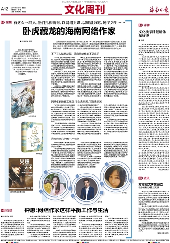 海南的网络作家在国内也占有一席之地,柳下挥、水千丞等在国内都具有一定的知名度,本土网络作家钟惠也有着独特而励志的故事。除此以外,海南还有诸多在默默耕耘的网络写作者,在网络作品IP化的今天,想在网络世界分得一杯羹并不容易,网络作家这个群体面临着创作压力大、竞争激烈等多重困扰。而随着IP时代到来,他们走上探索版权转换的道路,渴望得到更多的引导和支持。