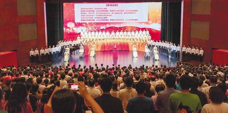 当晚,歌舞剧院座无虚席,歌声嘹亮。省税务局等16支队伍先后登台,演唱了多首经典红色歌曲,展现省直单位党员干部勇当先锋、做好表率的积极风貌,以及为海南建设自由贸易试验区、中国特色自由贸易港奉献青春热血的信心与担当。作为展演特邀合唱队,省残联代表队压轴上场,他们演唱的《没有共产党就没有新中国》深情流畅,引来现场热烈掌声。