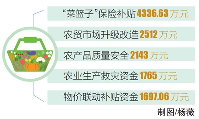 其中,涉及“菜篮子”保险补贴4336.63万元、农贸市场升级改造2512万元、农产品质量安全2143万元、农业生产救灾资金1765万元、物价联动补贴资金1697.06万元。