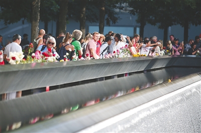 当地时间9月11日,在美国纽约的“9·11”纪念广场,人们在刻有遇难者姓名的纪念池旁悼念遇难者。当日是美国“9·11”事件18周年纪念日,在全美各地,民众以多种形式举行纪念活动。新华社记者 秦朗 摄