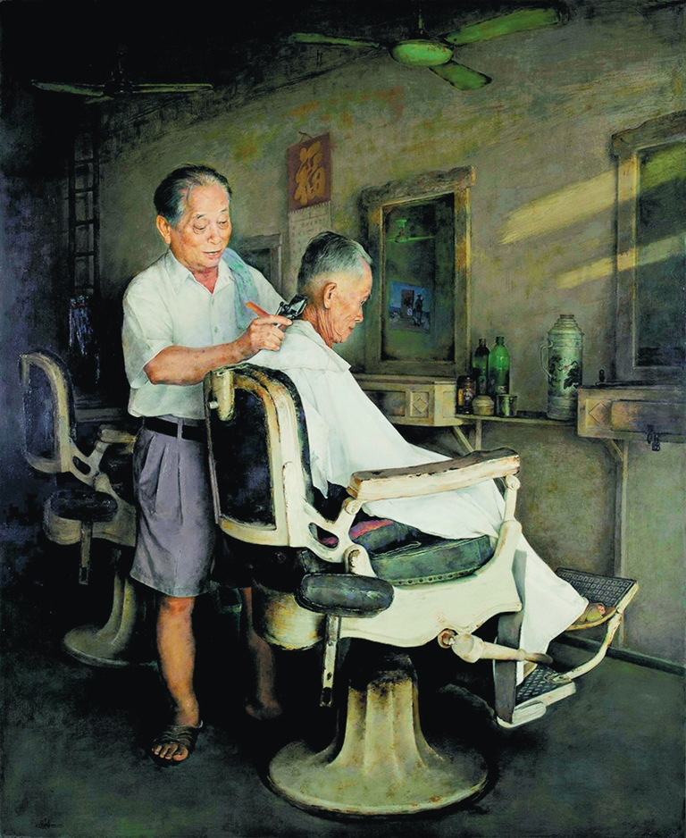 老式推子、旧电吹风、折叠剃头刀、铁制理发椅、斑驳的大镜片……海南画家梁峰的油画作品《祥和的日子》曾入选2014年第十二届全国美展,画中的理发店位于海南文昌抱罗镇,这家店和剃头师傅林鸿仍是很多老文昌人的岁月“记忆”,镇上的人都管林师傅叫“二公”,理发店也被街坊邻居亲切称为“二公理发铺”。
