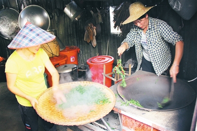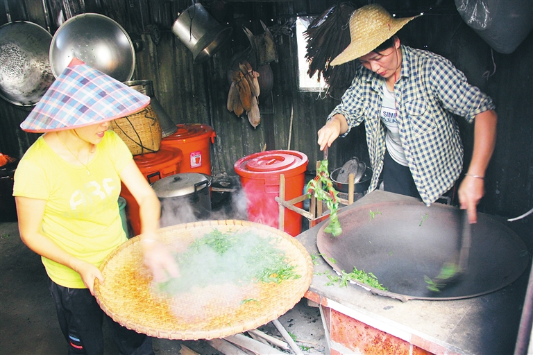 整个上午,采到的茶青总共不到30市斤,回到家,由于要做的是绿茶,妯娌二人顾不上吃饭,马上用大铁锅进行杀青,每次倒入四五斤茶青,一人倒,一人搅,大约两分钟,茶青变软,微微冒出白色水汽,便赶紧出锅,用小簸箕端给阿东和阿才,兄弟俩便在厨房的桌子上快速揉捻起来。阿东洗过了手,徒手揉搓颜色已经变深的茶青;阿才有点讲究,生怕茶叶的汁液染黑了双手,戴上了一双黄色的胶质手套。整个过程,兄弟俩操作速度极快,大汗淋漓,仿佛行军打仗一般,唯恐动作慢了,茶青被氧化,坏了味道。