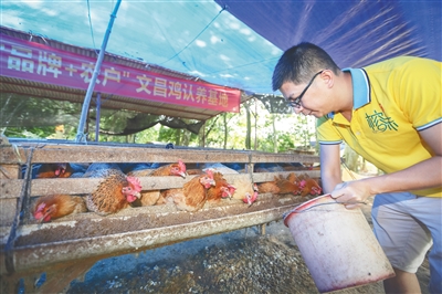 “通过网络加物流,文昌鸡‘飞’上了全国各地消费者的餐桌,美味得到了大家的认可。”郭泽枨原本在深圳从事IT行业,2014年他返乡创业养殖文昌鸡,并借助潭牛镇创建文昌鸡产业小镇的机遇创办了“榕味印记”公司,以“基地+农户+品牌”模式,定价回购文昌鸡,通过淘宝、微信等平台线上销售冰鲜文昌鸡,发展“互联网+文昌鸡”。