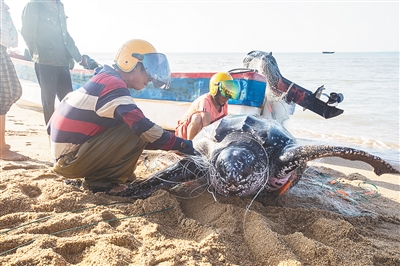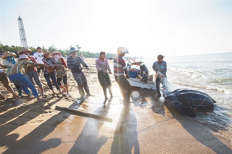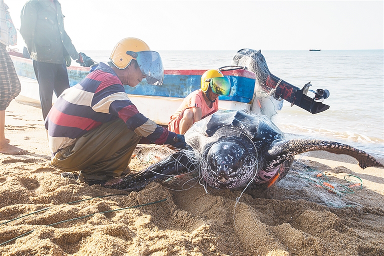 据介绍,该海龟为棱皮龟,是世界上龟鳖类中体型最大的一种,列入《世界自然保护联盟》(IUCN)濒危物种红色名录,属国家二级保护动物。据考证,除了澳大利亚的大堡礁以外,全世界几乎没有棱皮龟的栖息地,在海南也极为罕见。