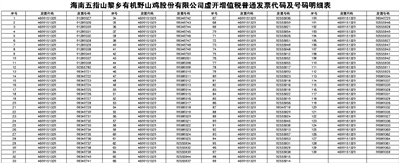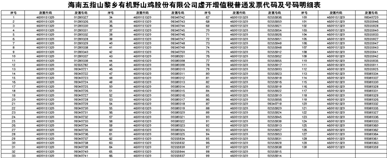 海南五指山黎乡有机野山鸡股份有限公司虚开增值税普通发票代码及号码明细表
