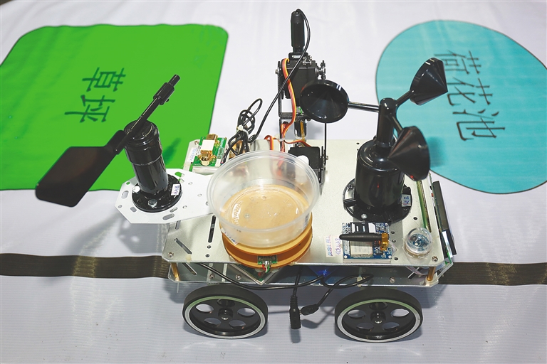 郭彦宏和刘佳琳在地上铺上公园模拟地形图,启动“湿地卫士”机器人。在光敏传感器的作用下,机器人可按照预先设定的路线“巡逻”。行驶至“荷花塘”时,机器人装载有水体PH值测量器的机械手臂伸进“荷花塘”内,即可完成水体PH值、水温的检测。“其余的风向、风速、空气温度等数值,都可以在机器人巡逻的过程中实时完成。”郭彦宏说。